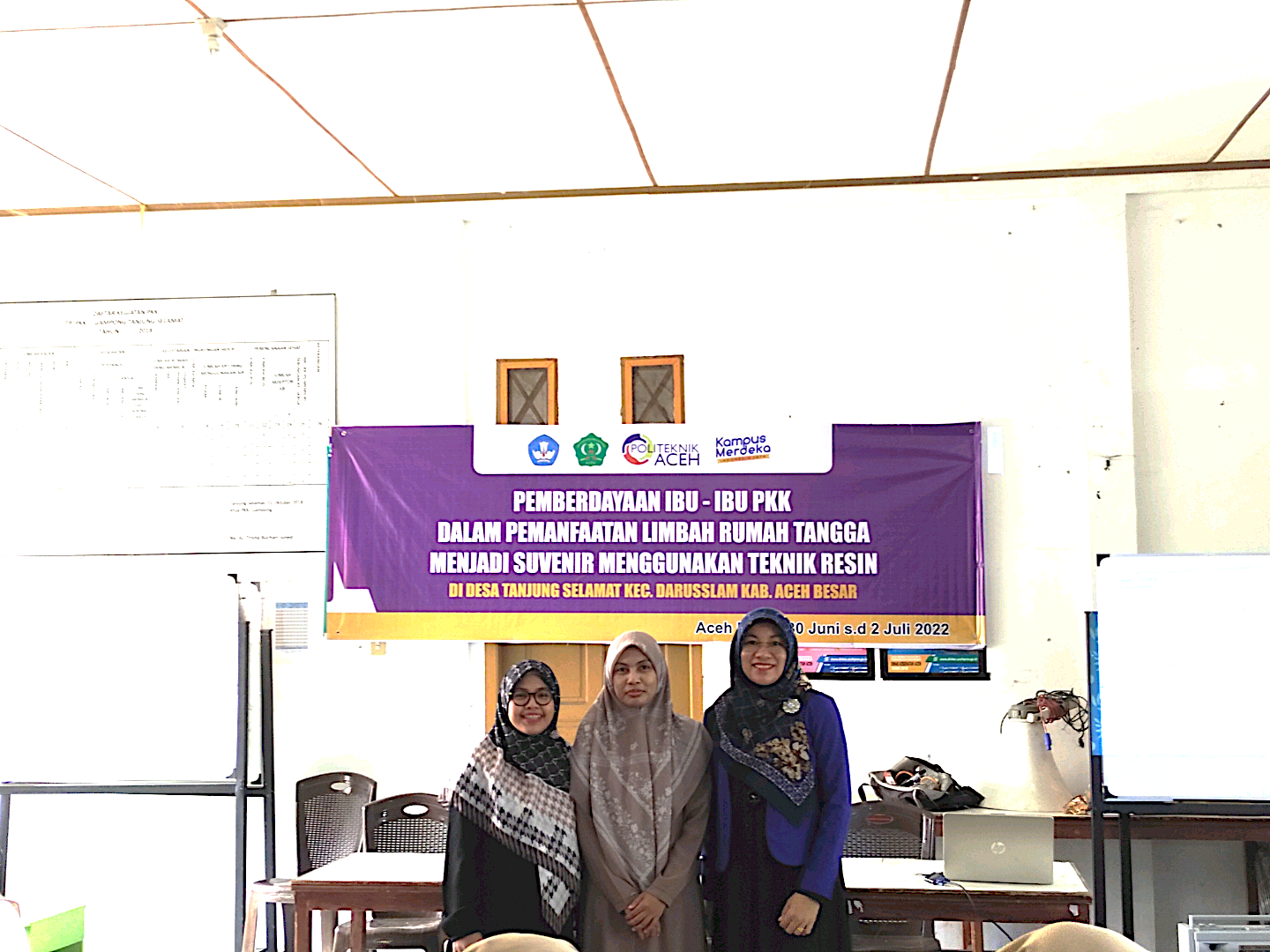 Akademisi Universitas Abulyatama dan Politeknik Aceh menggelar kegiatan Pengabdian kepada Masyarakat di Desa Tanjung Selamat, Kecamatan Darussalam, Kabupaten Aceh Besar pada tanggal 30 Juni 2022 sampai 2 Juli 2022 dengan judul “Pemberdayaan Ibu-Ibu PKK Dalam Pemanfaatan Limbah Rumah Tangga Menjadi Suvenir Menggunakan Teknik Resin”.