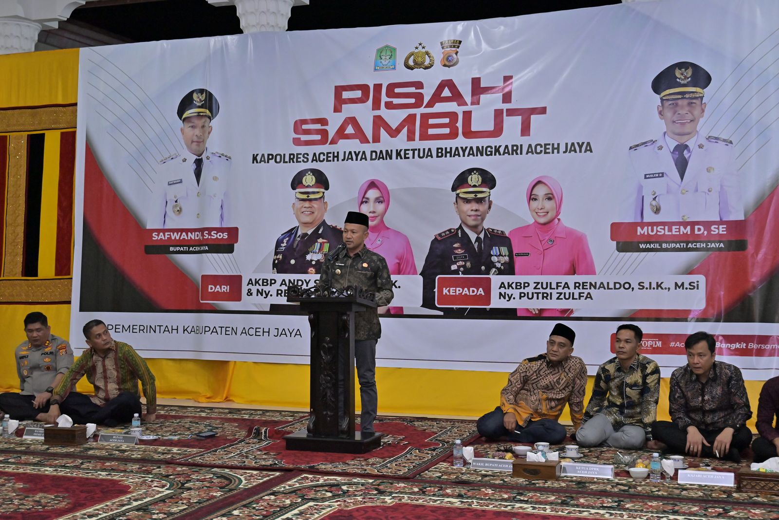 Dalam sambutannya, Bupati Safwandi menyampaikan penghargaan dan apresiasi setinggi-tingginya kepada AKBP Andy Sumarta atas pengabdian dan dedikasinya selama menjabat sebagai Kapolres Aceh Jaya.