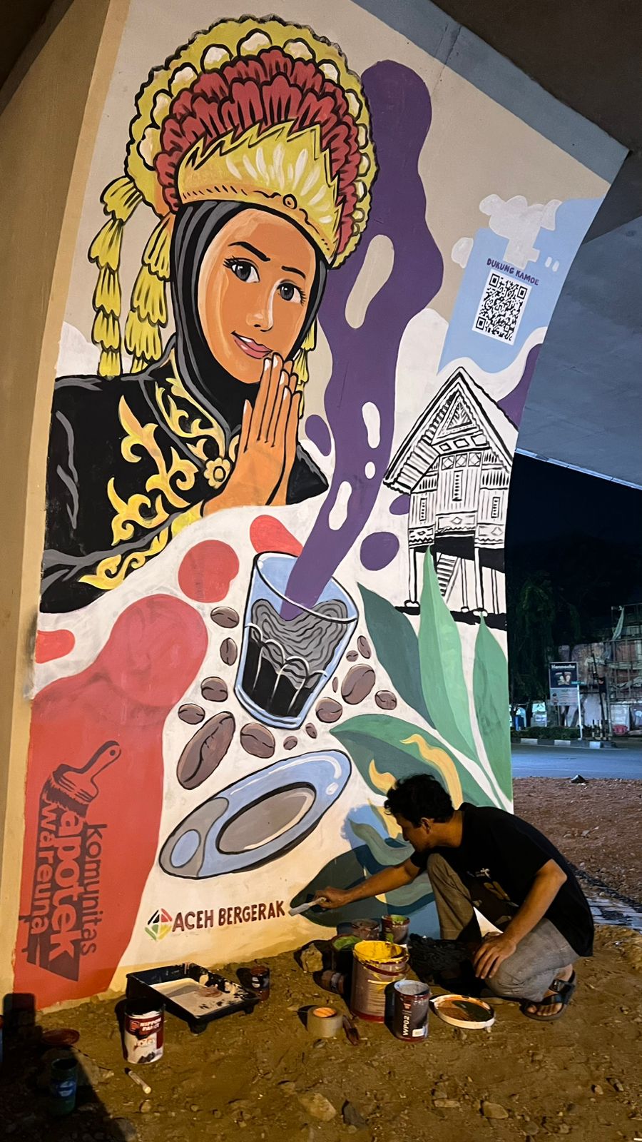 BandaAcehAsia.com | Banda Aceh – Para perupa Aceh yang tergabung dalam apotik warna menggelar kegiatan mewarnai tiang Flyover di Simpang Surabaya, Banda Aceh, sebagai upaya memperindah kota dengan sentuhan seni mural. Kegiatan ini bertujuan untuk memberikan nuansa positif bagi kota Banda Aceh, sekaligus menyampaikan pesan-pesan yang bermakna melalui karya seni mereka, Minggu (11/01/2025).
