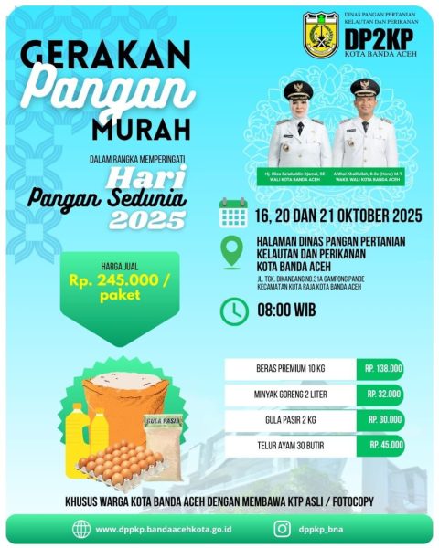 Acehasia.com | Banda Aceh- Dalam rangka memperingati Hari Pangan Sedunia 2025, Pemerintah Kota Banda Aceh melalui Dinas Pangan Pertanian Kelautan dan Perikanan (DP2KP) Kota Banda Aceh akan mengadakan Gerakan Pangan Murah (GPM) pada esok hari tanggal 16 Oktober 2025 di Halaman Kantor DP2KP Kota Banda Aceh.