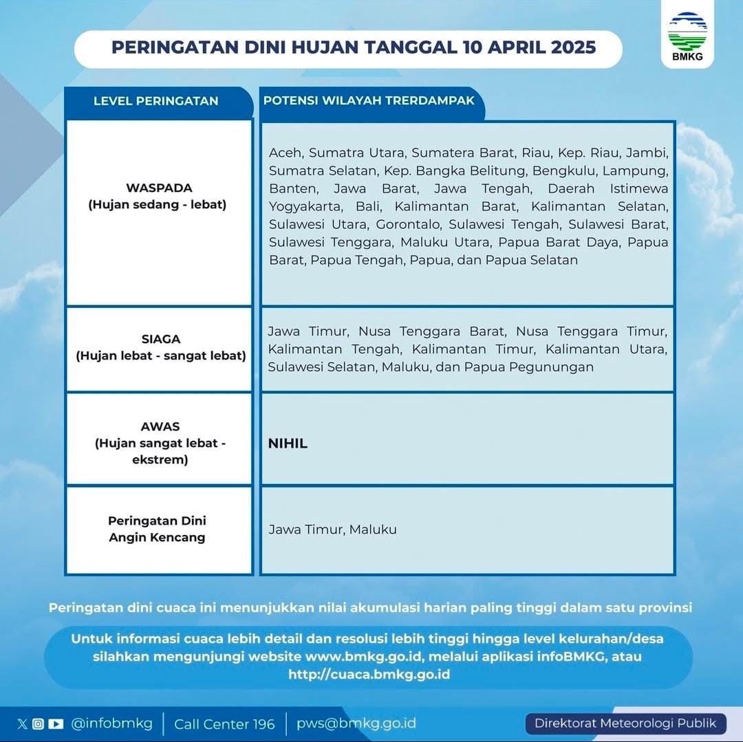 3. Tanggal 11 April 2025 meliputi wilayah Gayo Lues, Aceh Tenggara, Aceh Tamiang, Aceh Tengah, Bener Meriah, Pidie, Aceh Timur, Aceh Barat, Nagan Raya dan Aceh Barat Daya.(Rin)
