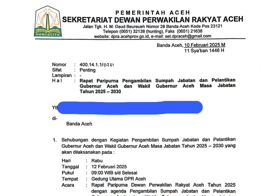 Dalam surat tersebut disebutkan bahwa Kegiatan Pengambilan Sumpah Jabatan dan Pelantikan Gubernur dan Wakil Gubernur Aceh Masa Jabatan Tahun 2025-2030.