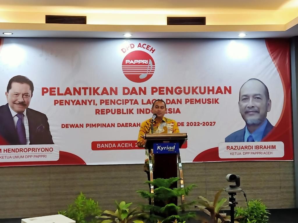 Hal itu disampaikan Gubernur Aceh melalui Kepala Dinas Kebudayaan dan Pariwisata (Kadisbudpar) Aceh, Jamaluddin, saat memberikan sambutan Pelantikan Dewan Pengurus Daerah Persatuan Artis Penyanyi, Pencipta Lagu, dan Pemusik Republik Indonesia (DPD PAPPRI) Provinsi Aceh yang digelar di Hotel Kyriad Muraya, Senin, 21 Februari 2022.