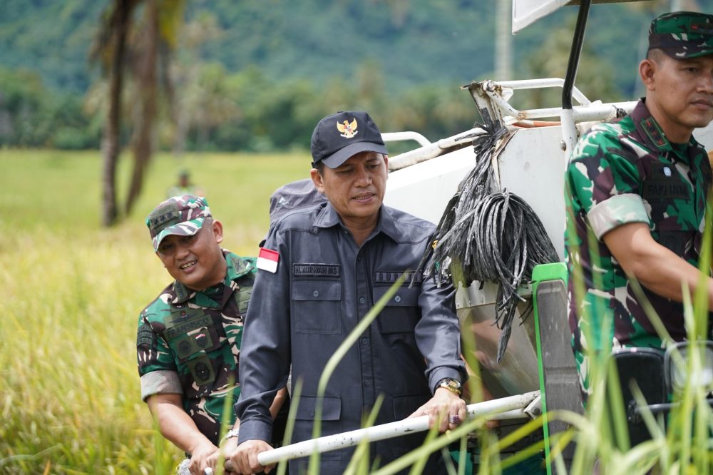 Bupati Aceh Selatan bersama aster Kasdam IM Kolonel Inf Fransisco SE, M.I.Kom, dan Pimpinan Perum Bulog Aceh Ihsan SP beserta rombongan turun langsung ke lokasi panen padi masyarakat di gampong Alai, kecamatan Kluet Timur Kabupaten Aceh Selatan, Rabu (16/4/2025).
