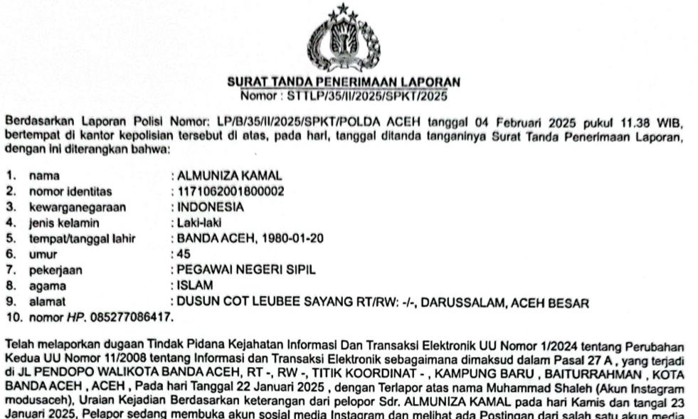Laporan resmi terkait tindak pelanggaran UU ITE tersebut telah diterima oleh Polda Aceh dengan Nomor Laporan STTLP/35/II/2025/SPKT/2025. Selanjutnya kuasa hukum dan Almuniza menyerahkan sepenuhnya proses penyelidikan dan penyidikan kepada aparat penegak hukum guna mendapatkan keadilan.