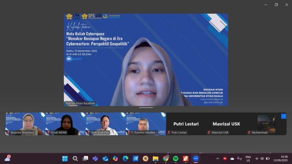 Acehasia.com | Banda Aceh – Program Magister Damai dan Resolusi Konflik, Sekolah Pascasarjana Universitas Syiah Kuala (USK), Banda Aceh, menggelar kuliah tamu bertajuk “Menakar Kesiapan Negara di Era Cyberwarfare dari Perspektif Geopolitik”, Sabtu (13/9/2025). Kuliah umum ini menghadirkan Dr. Bedi Budiman, S.IP, M.Si. Dosen Hubungan Internasional FISIP Universitas Pasundan, Bandung sebagai narasumber kunci.