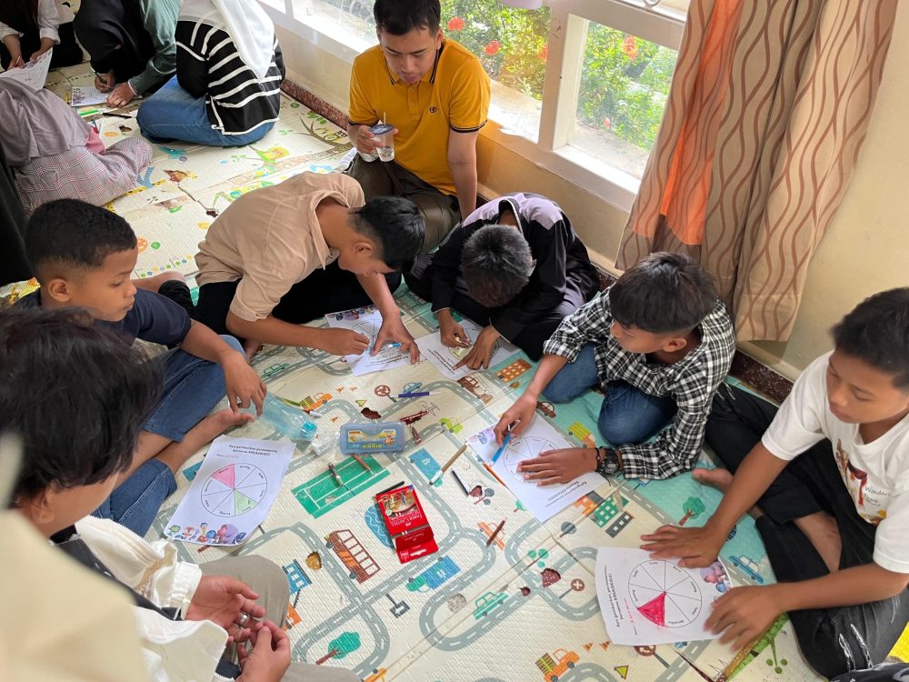 Setelah post-test untuk mengukur pemahaman peserta, kegiatan dilanjutkan dengan sesi praktik. Anak-anak dibagi ke dalam empat kelompok kecil dan diberikan alat gambar serta kertas. Mereka diminta untuk menuangkan perasaan, pikiran, atau kenangan dalam bentuk gambar. Sesi ini berlangsung emosional sekaligus menggembirakan, karena anak-anak mulai mengungkapkan suasana hati mereka melalui simbol dan warna.