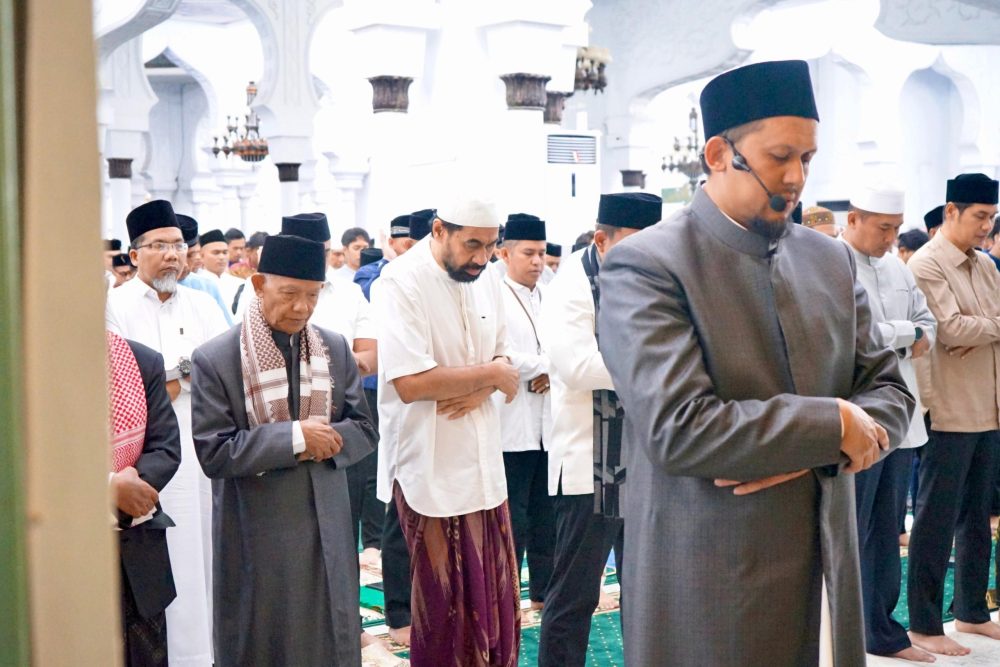 Salat Iduladha dipimpin oleh Ustaz Ivan Aulia, Lc., M.A., sebagai imam, dan Prof. Damanhuri Basyir, M.Ag., sebagai khatib. Ribuan jemaah terlihat memadati area dalam dan halaman Masjid Raya.