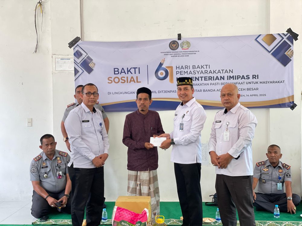 Acehasia.com | Aceh Besar – Kantor Wilayah Direktorat Jenderal Pemasyarakatan (Ditjenpas) melakukan kegiatan bakti sosial dalam peringatan Hari Bakti Pemasyarakatan ke-61. Yusrizal selaku Kabag Tata Usaha dan Umum mengatakan ini merupakan momentum yang tepat untuk menumbuhkan nilai-nilai kebersamaan, kepedulian, solidaritas antara jajaran dan masyarakat.