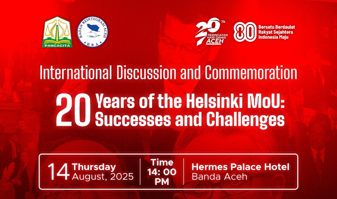 Aceh Asia.com | Banda Aceh – Banda Aceh akan menjadi pusat perhatian dunia pada Kamis, 14 Agustus 2025. Ratusan tokoh terkemuka Aceh, akademisi, aktivis perdamaian, serta diplomat dari 12 negara dijadwalkan berkumpul di Hermes Palace Hotel untuk memperingati 20 tahun penandatanganan Nota Kesepahaman (MoU) Helsinki yang mengakhiri konflik bersenjata di Aceh pada 2005.