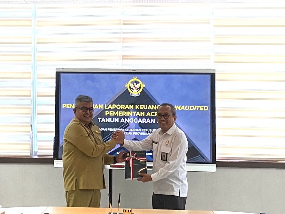 Banda Acech – Sekretaris Daerah (Sekda) Aceh, Bustami Hamzah, menyerahkan Laporan Keuangan Pemerintah Aceh Tahun Anggaran 2022 kepada Badan Pemeriksa Keuangan (BPK) Republik Indonesia Perwakilan Aceh, Senin (27/02/2023). Laporan tersebut diterima langsung Kepala BPK RI Perwakilan Aceh, Masmudi.