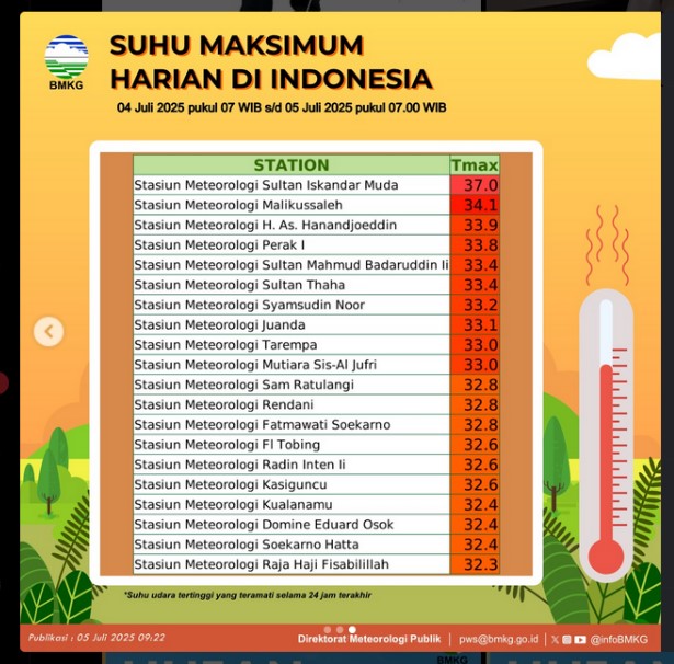 AcehAsia.com | Banda Aceh – Badan Meteorologi, Klimatologi, dan Geofisika (BMKG) memprakirakan suhu panas di wilayah Aceh akan berlangsung hingga tiga hari ke depan, mulai 6-9 Juli. Suhu maksimum tercatat mencapai 37°C di Stasiun Meteorologi Sultan Iskandar Muda pada Jumat (04/07/2025), pukul 07.00 WIB.