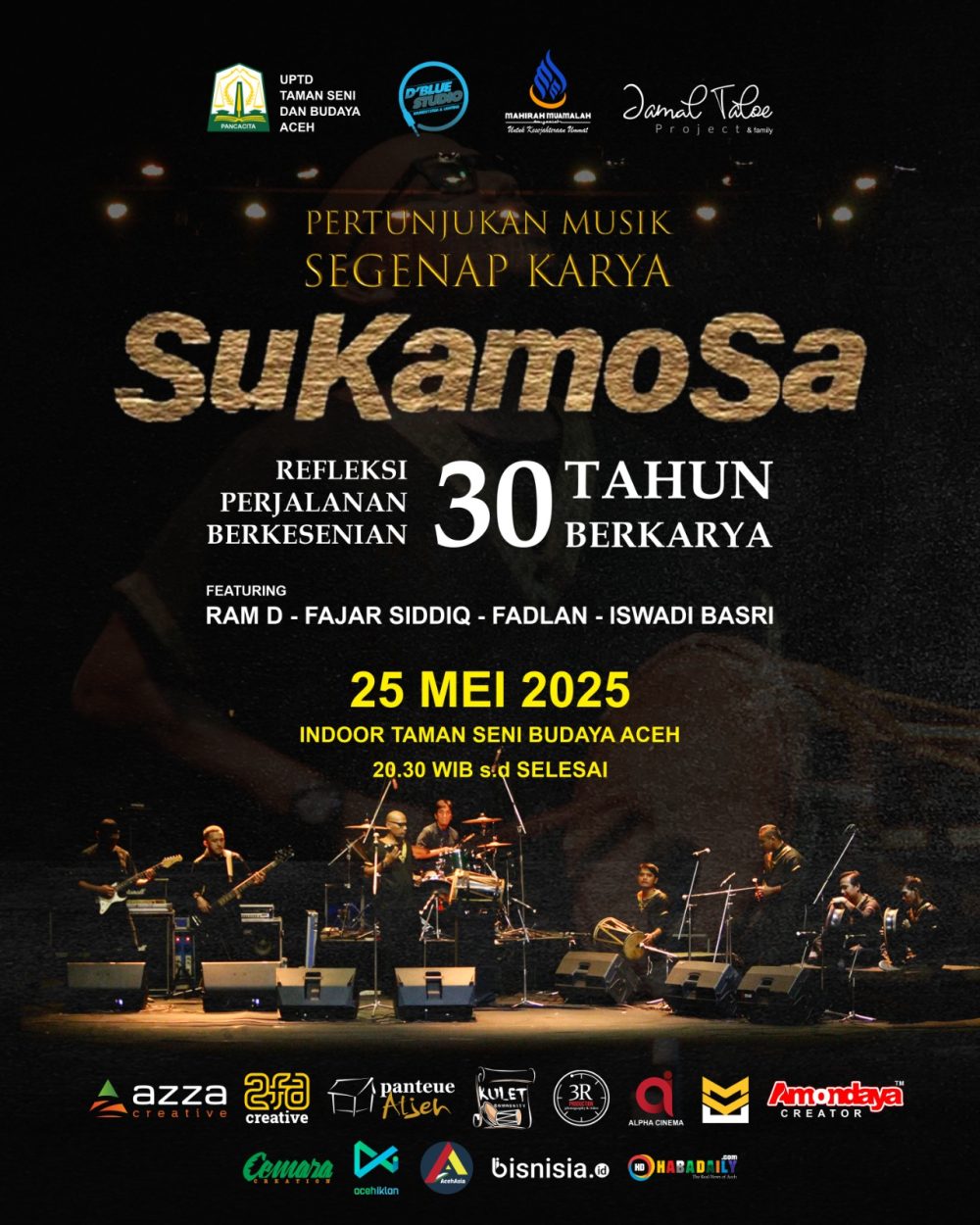 AcehAsia.com | Banda Aceh — Komunitas musik etnik modern SuKamoSa akan menggelar pertunjukan musik bertajuk “Segenap Karya SuKamoSa” pada Minggu, 25 Mei 2025, di Gedung Indoor Taman Budaya Aceh. Acara ini menjadi penanda 30 tahun perjalanan berkesenian kelompok yang dipimpin oleh seniman musik Aceh, Jamal Taloe.