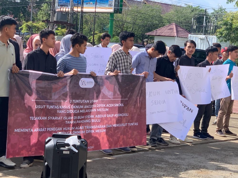 AcehAsia.com | Banda Aceh – Aksi demonstrasi berlangsung di halaman Mahkamah Syariah Provinsi Aceh oleh sejumlah pemuda yang tergabung dalam Kesatuan Aliansi Pemuda Peduli Rakyat Aceh (KAPPRA) dengan jumlah sekitar 50 orang, Kamis (09/1/2024).