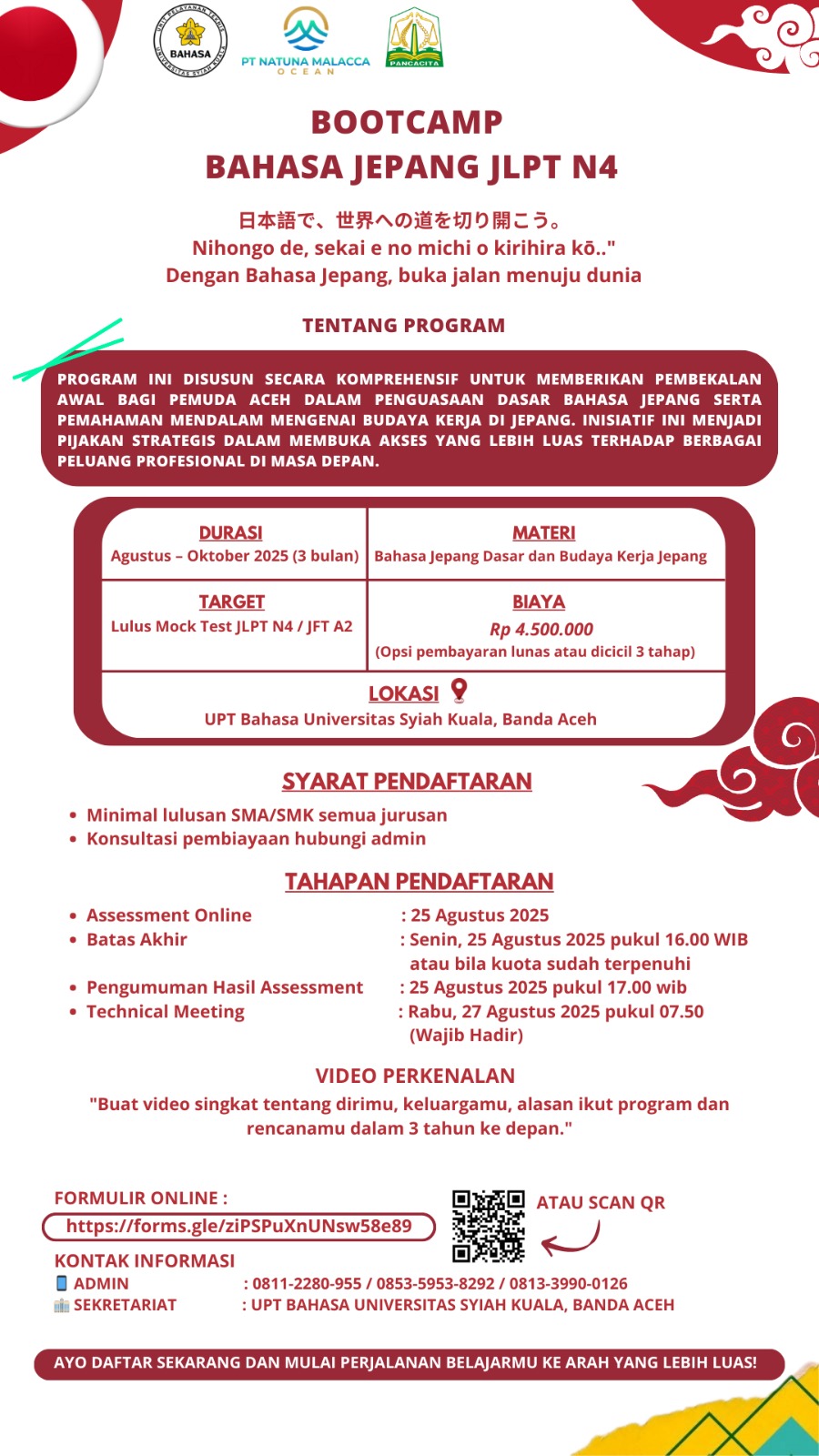 Aceh Asia com | Banda Aceh – Universitas Syiah Kuala (USK) melalui UPT Bahasa resmi meluncurkan Bootcamp Bahasa Jepang JLPT N4 bekerja sama dengan PT Natuna Malacca Ocean. Program ini dirancang untuk mempersiapkan generasi muda Aceh menguasai bahasa Jepang sekaligus memahami budaya kerja, sebagai bekal menuju kesempatan kerja di Negeri Sakura.