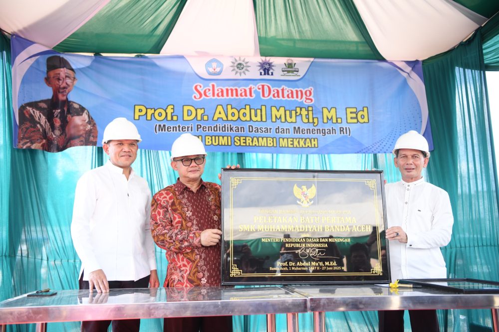 AcehAsia.com | Banda Aceh – Wakil Gubernur Aceh, H. Fadhlullah, SE, bersama Menteri Pendidikan Dasar dan Menengah Republik Indonesia, Prof. Abdul Mu’ti, secara resmi meletakkan batu pertama pembangunan SMK Muhammadiyah Banda Aceh, Jumat (27/6/2026) sore.