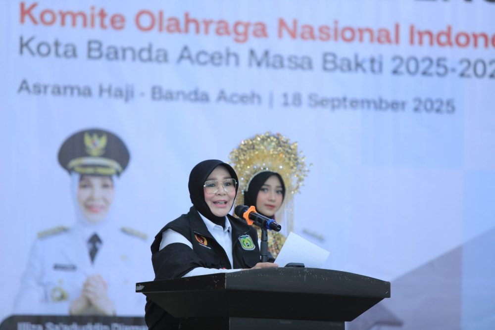 Banda Aceh – Wali Kota Banda Aceh, Illiza Sa’aduddin Djamal, menghadiri acara pengukuhan dan melantik Pengurus Komite Olahraga Nasional Indonesia (KONI) Kota Banda Aceh masa bakti 2025-2029 dalam acara yang digelar di Asrama Haji, Kamis (18/9/2025).