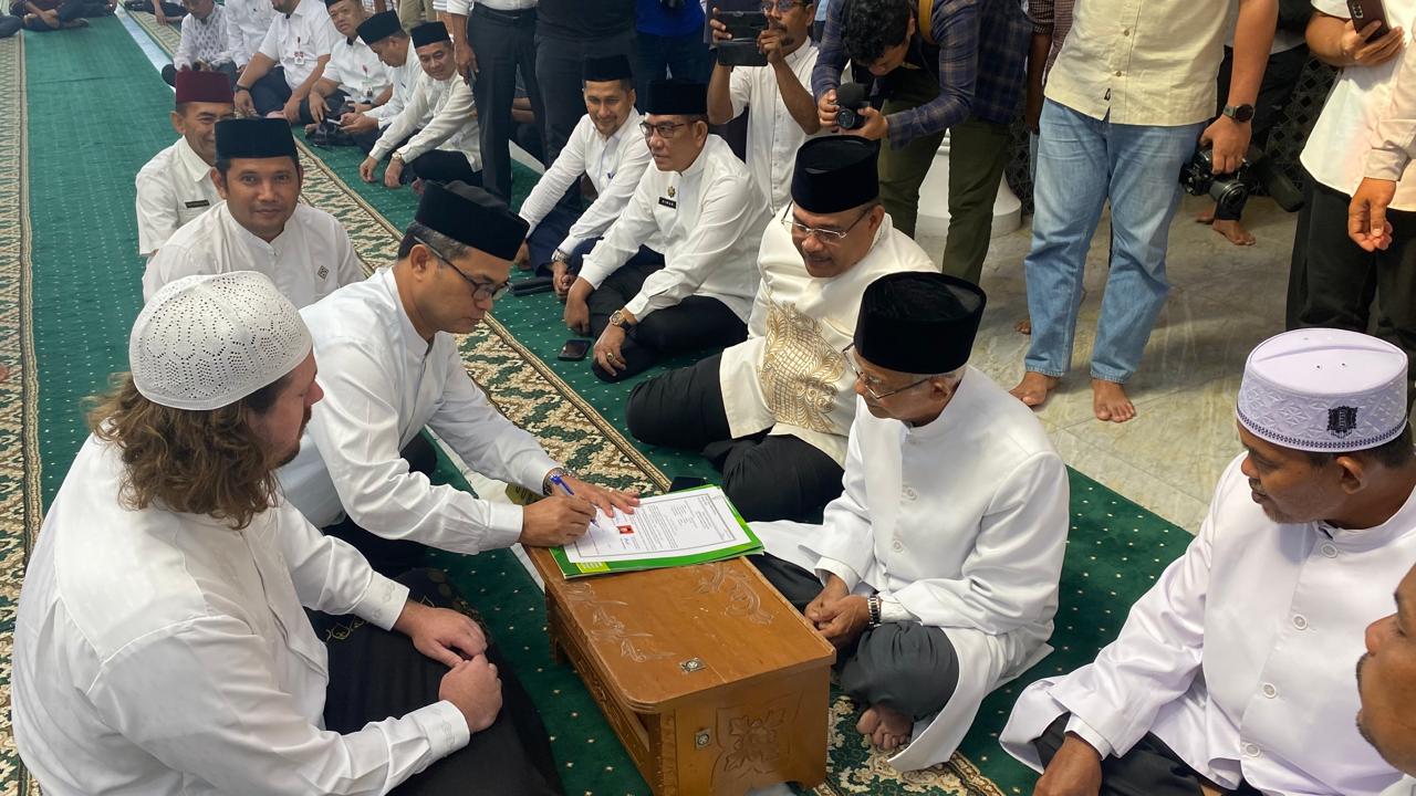 “Muhammad Wildan sahabat anak saya. Beberapa hari yang lalu datang ke Aceh dan sudah berniat masuk islam di Aceh karena mendengar daerah ini memiliki syariat Islam,” ujarnya.