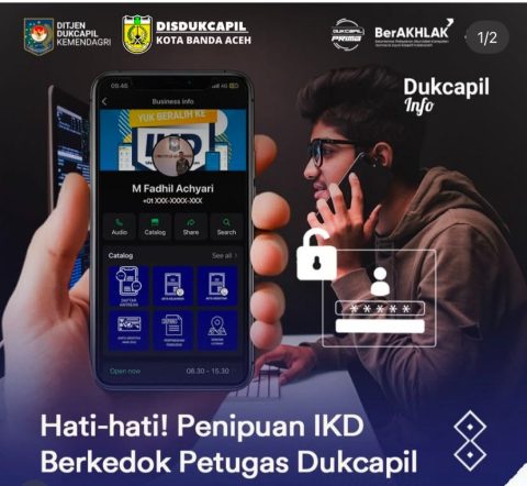 Banda Aceh – Kepala Dinas Kependudukan dan Pencatatan Sipil (Disdukcapil) Kota Banda Aceh, Emila Sovayana mengingatkan kepada warga kota untuk lebih berhati-hati terhadap penipuan yang mengatasnamakan petugas Disdukcapil dengan modus pelaku meminta data pribadi melalui telepon atau WhatsApp dengan dalih aktivasi Identitas Kependudukan Digital (IKD).